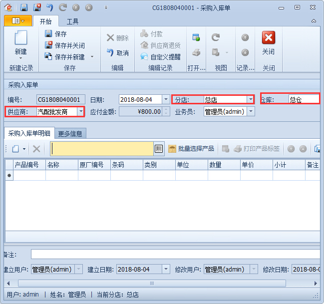1、點(diǎn)擊【庫(kù)存管理】→【采購(gòu)入庫(kù)單】→點(diǎn)擊菜單欄中“新建”進(jìn)入采購(gòu)入庫(kù)單中,首先選擇購(gòu)入的門(mén)店和需要存放這批產(chǎn)品的倉(cāng)庫(kù),然后填入產(chǎn)品采購(gòu)的供應(yīng)商,如圖: