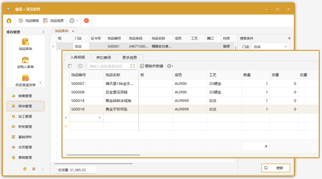 軟件滿足門店(鉆石、金、銀、翡翠、玉器等)進銷存、鑲嵌、委外加工等管理。