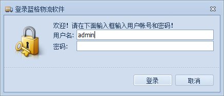 在彈出的登錄窗口中,輸入用戶名和密碼,試用版的用戶名默認為admin,密碼為空。點擊“登錄”開始登錄傲藍物流軟件。